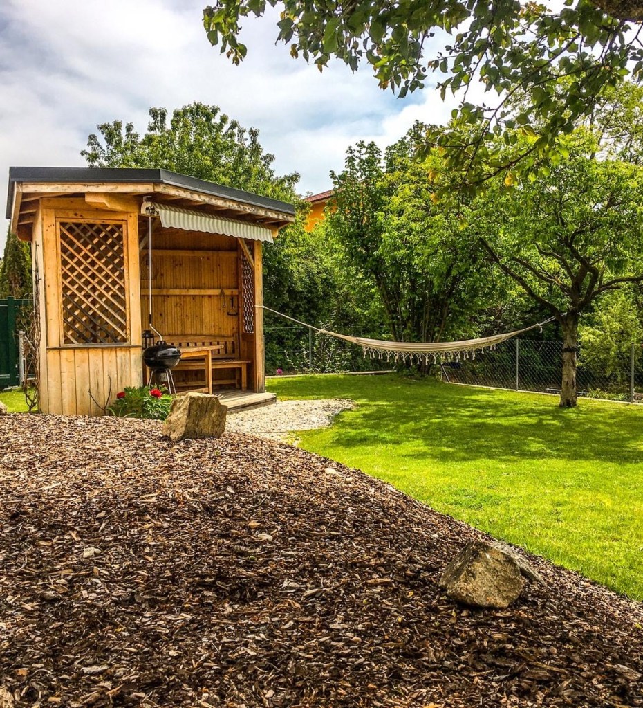 Ein 700m² großer Garten umgibt das Ferienhaus. Sonnige und schattige Plätze laden zum Verweilen ein. Auf zwei Ebenen gedeihen Obstbäume, Beerensträucher, Kräuter und Gemüsepflanzen. Ein Holzkohlegrill bringt Abwechslung in die Urlaubsküche. In der windgeschützten Pergola lauscht man in lauen Sommernächten spätabends noch dem Zirpen der Grillen.