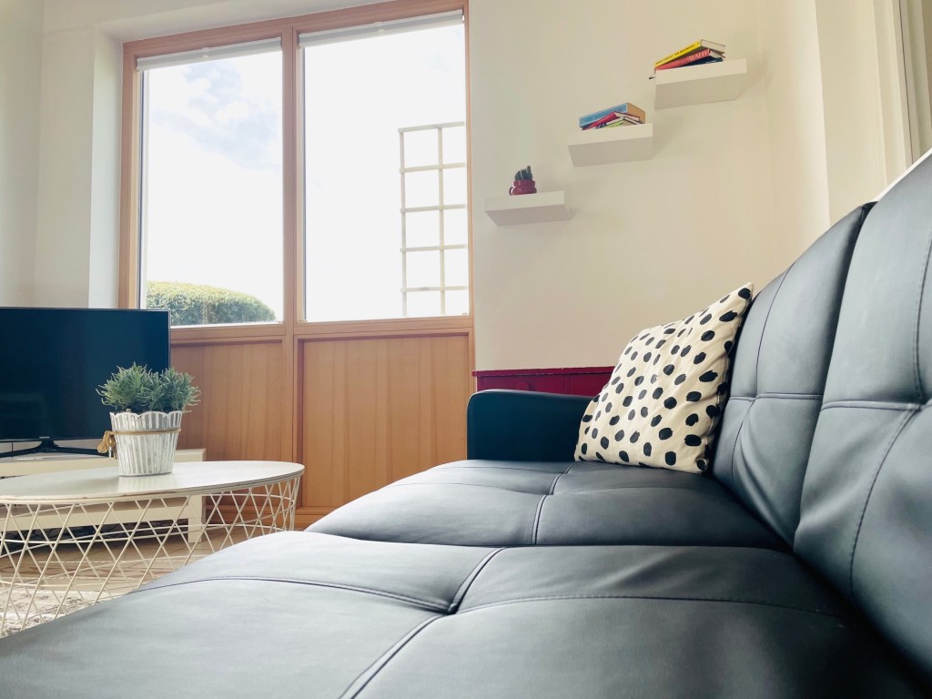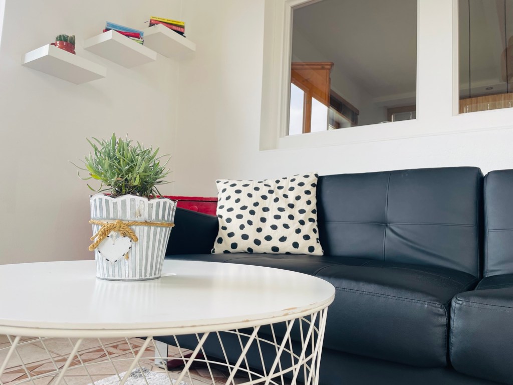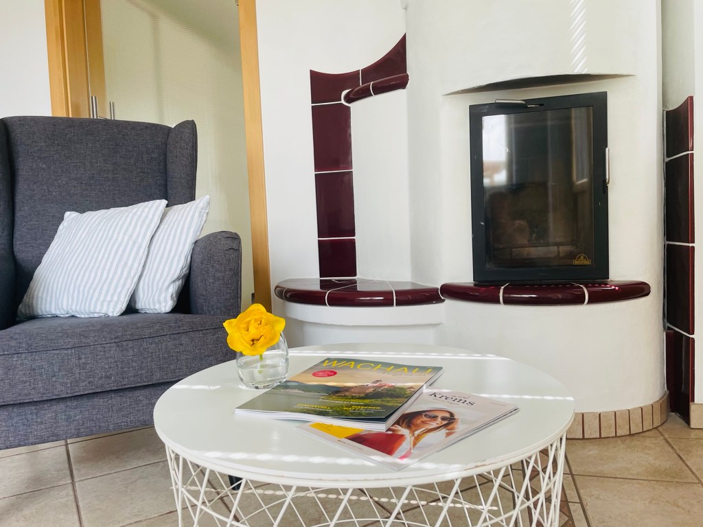 Im sonnendurchfluteten Wohnzimmer mit Panoramablick in den Garten lassen sich entspannte Stunden verbringen. An kühleren Tagen sorgt ein Kachelofen für wohlige Wärme.